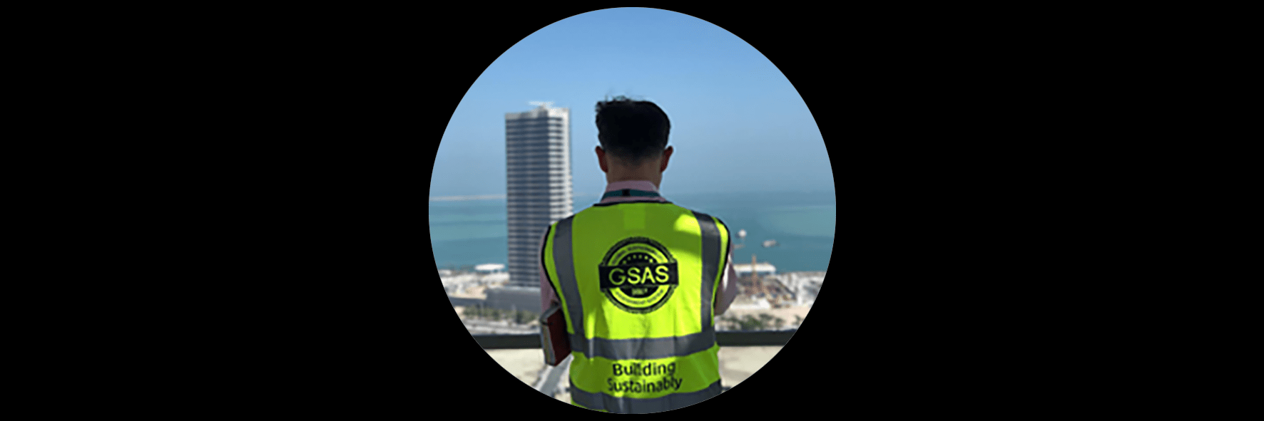 📷 [Imagen: Arquitecto en obra Qatar con chaleco GSAS]